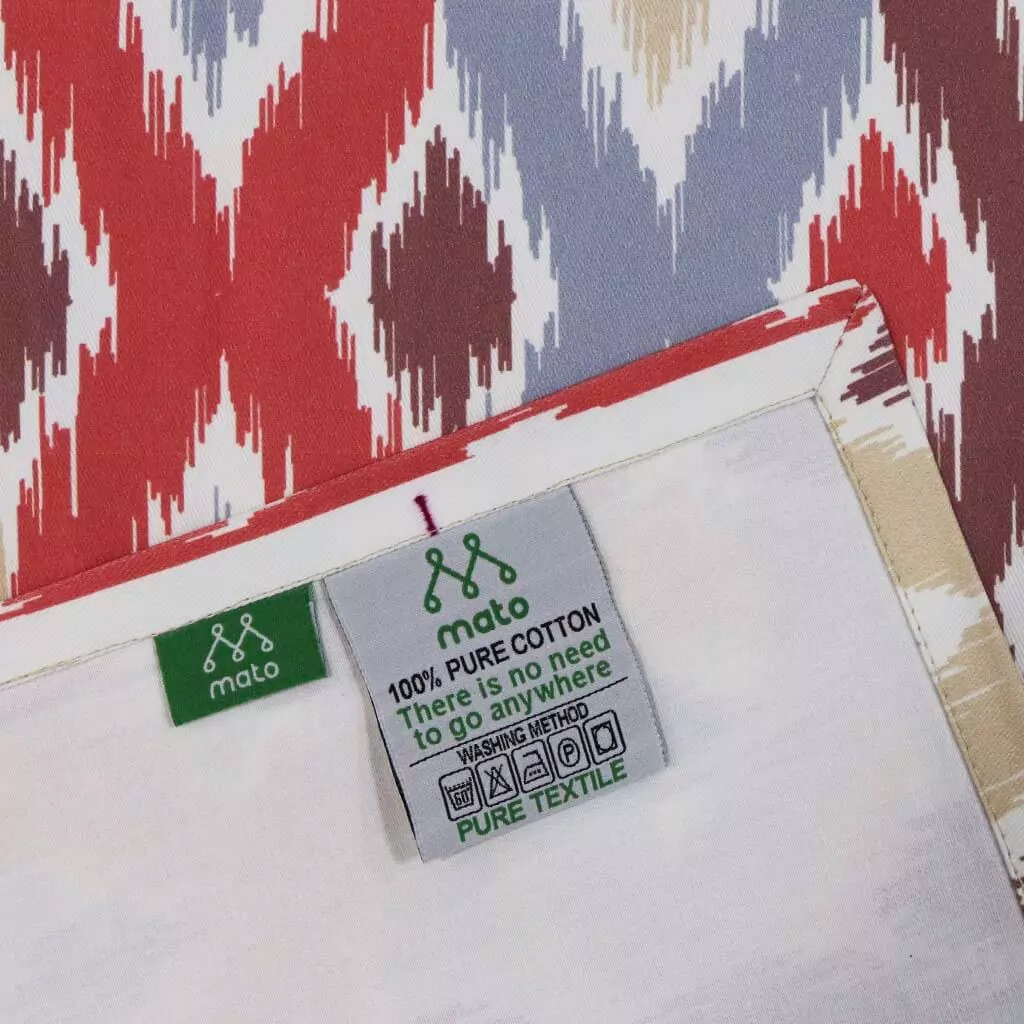 Скатерть MATO выполнена из 100% натурального хлопка и украшена традиционным узором икат, который придаёт столу тёплый и стильный акцент. Натуральная хлопковая ткань хорошо пропускает воздух, приятна на ощупь, устойчива к многократным стиркам и сохраняет форму и цвет при правильном уходе.