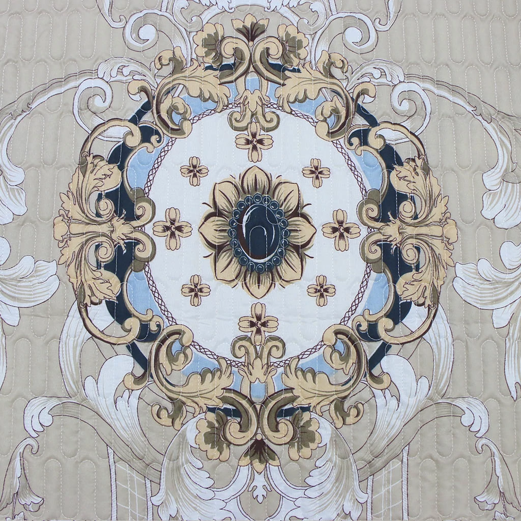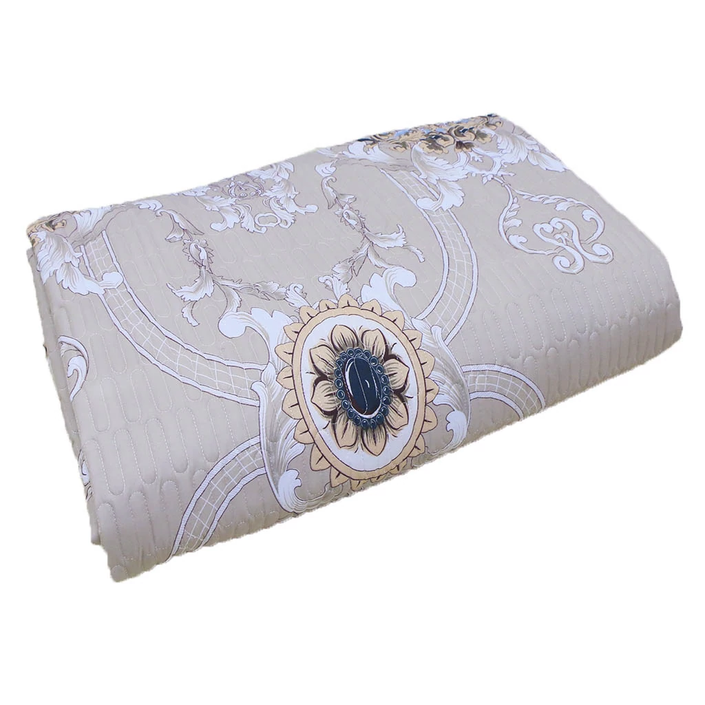 Покрывало стеганое произведено из ткани микрофибра с наполнителем из метражного синтепона. Микрофибра - гипоаллергенная ткань, состоящая из полимерных и натуральных волокон, в том числе нейлона, полиэстера, хлопка или вискозы (микроволокна толщиной в несколько микрометров). Она проста в уходе, приятная на ощупь и красивая. Хорошо впитывает влагу.