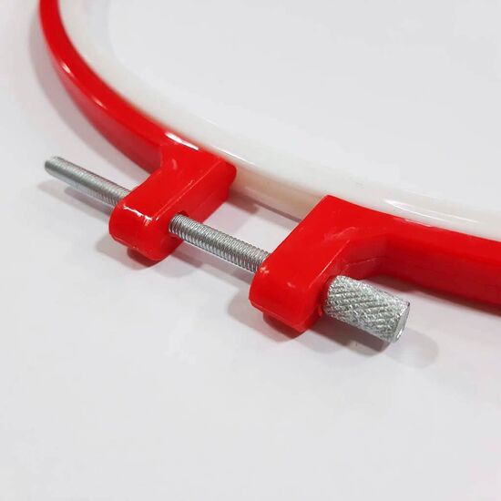- Закрепить ткань в пяльцах очень просто, для этого развинчиваем винт на раме, кладем ткань на белое кольцо, надеваем рамку на кольцо и стягиваем винт, попутно отрегулируем натяжение ткани.