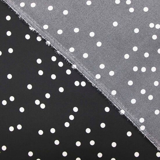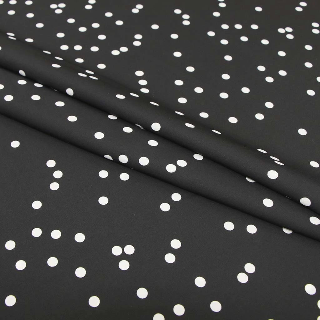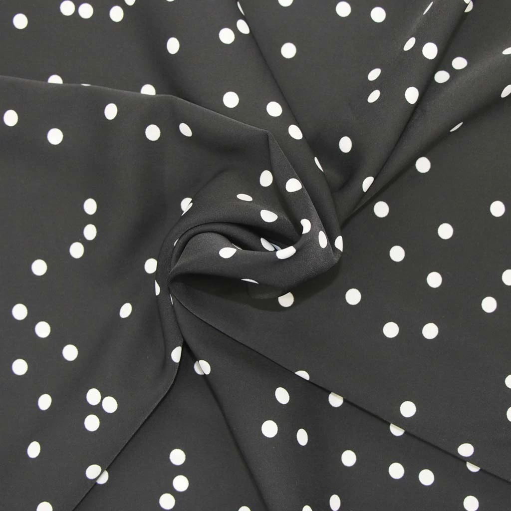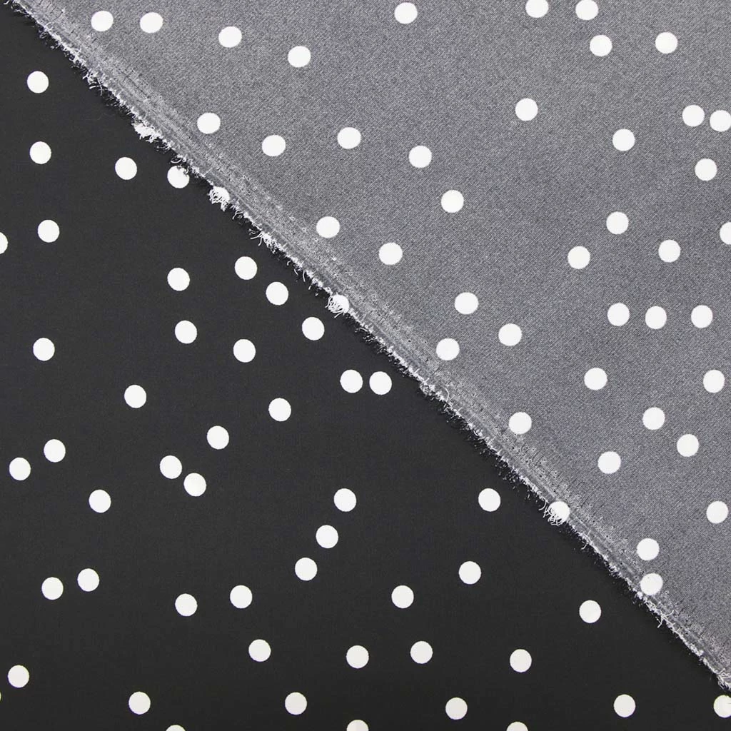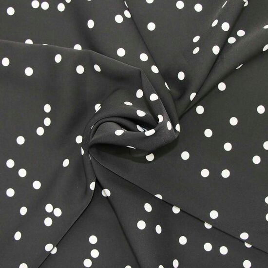 Измир — вискозная ткань для платьев, туник и рубашек 100% вискоза, ширина 145 см в белый горошек на черном асимметрия
